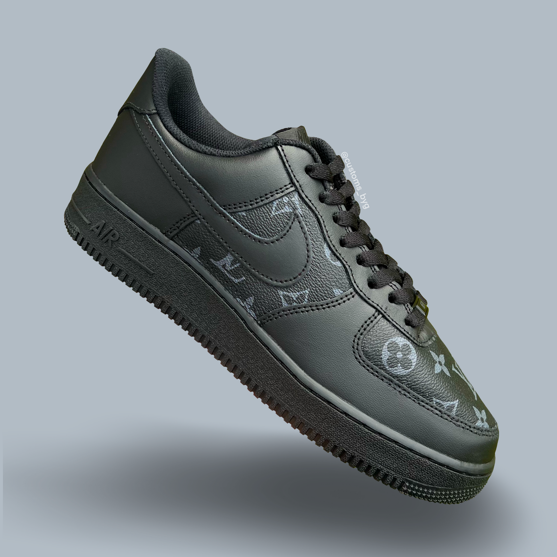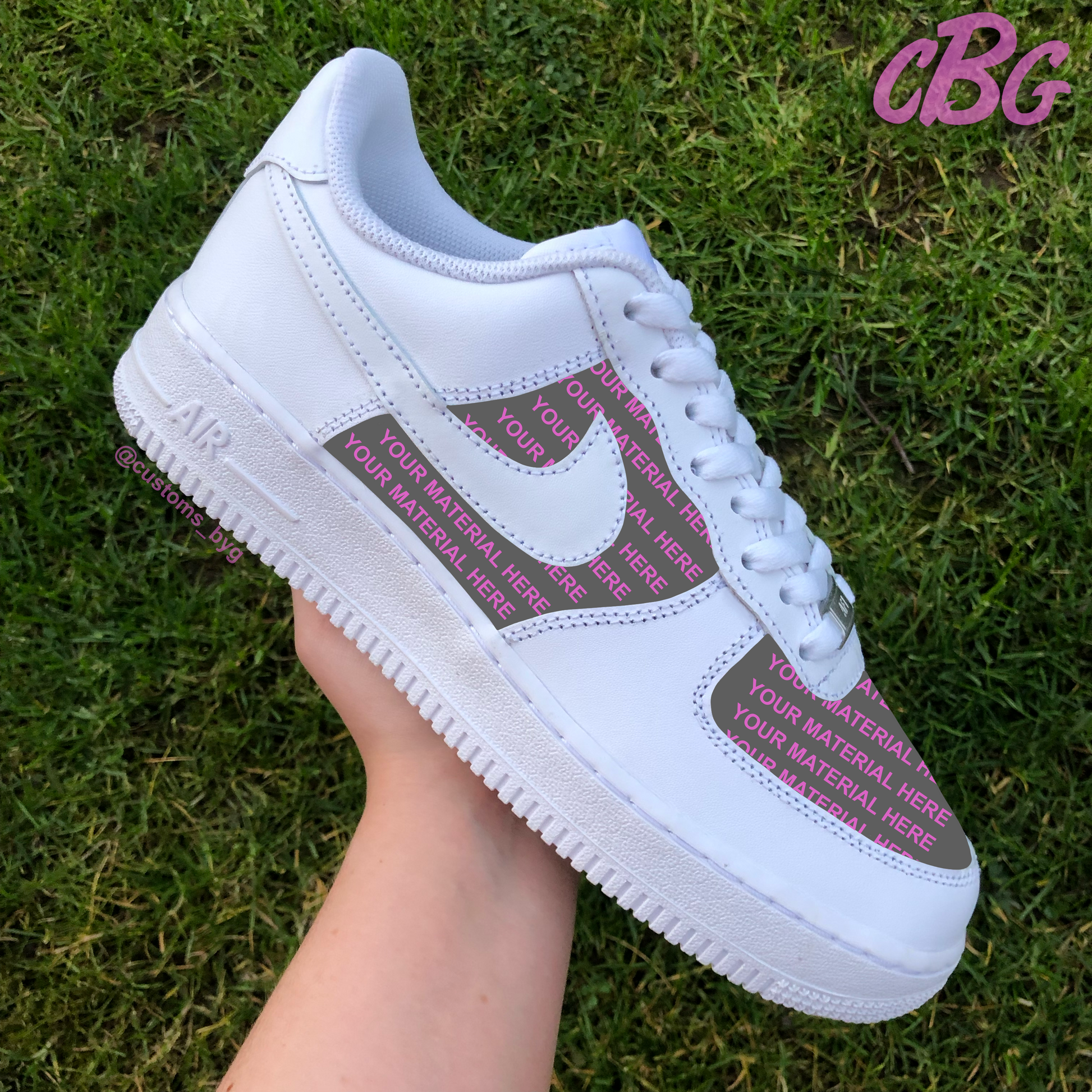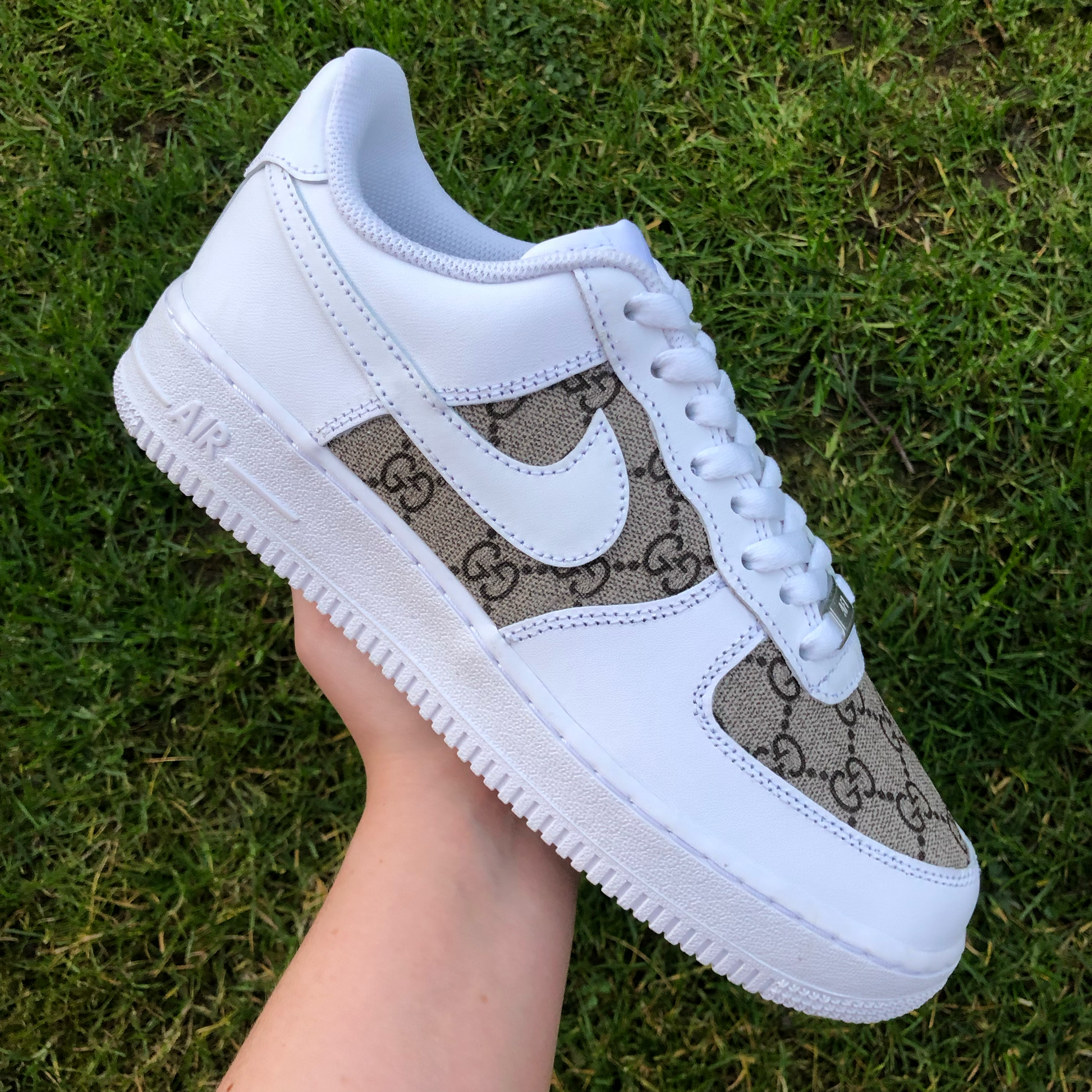 Custom AF1 with material of your choice on the toe and mid panels. New material is tucked under existing panels, glued then sewn back through the original holes for maximum durability. Unlike our other customs, these can be placed in the washing machine in on the lowest heat setting.